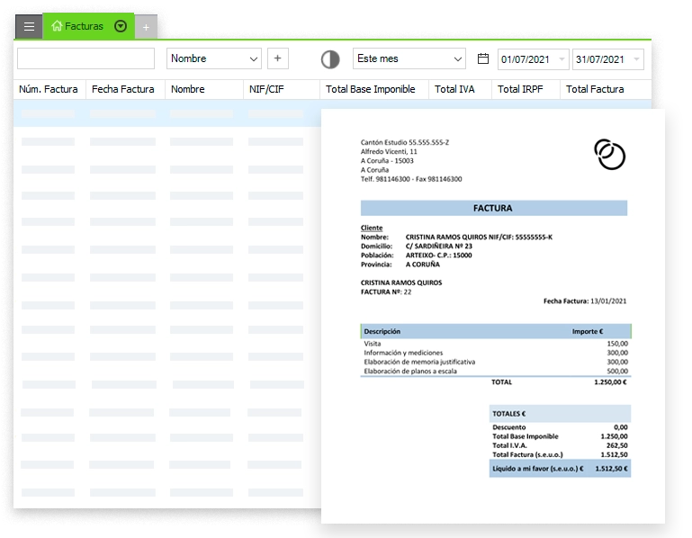 Control total de tus facturas y cobros: cobrado, pendiente, vencido, etc. Agiliza la impresión y el envío de tus facturas. Genera automáticamente listados y modelos contables.