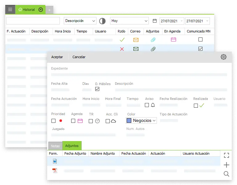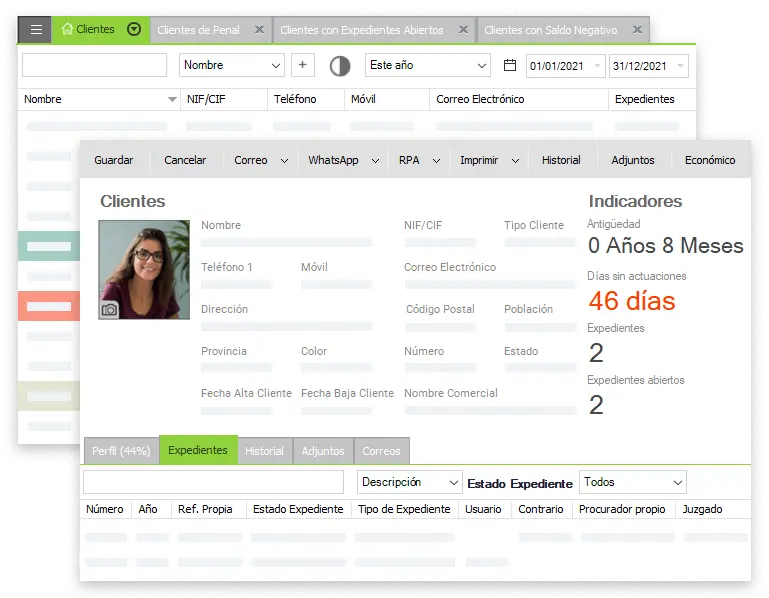 Entra en cada ficha o expediente y tenlo todo (correos, notificaciones, documentos, vencimientos, señalamientos, etc.). Tu servicio será el mejor y más personal.
